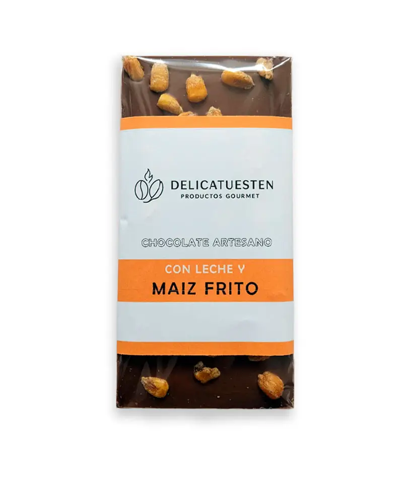 Tableta de chocolate con leche y maíz frito, un potente sabor a cacao tostado enriquecido con un buqué de matices aromáticos, contrastado con el maíz frito. Una gran experiencia de sabor.