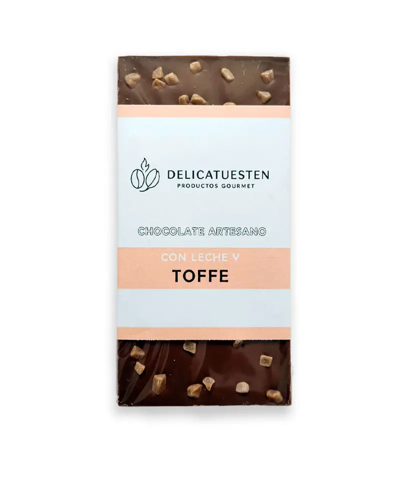 Tableta de chocolate con leche y toffee con frutas, un potente sabor a cacao tostado enriquecido con un buqué de matices aromáticos, potenciado con trocitos de caramelo.